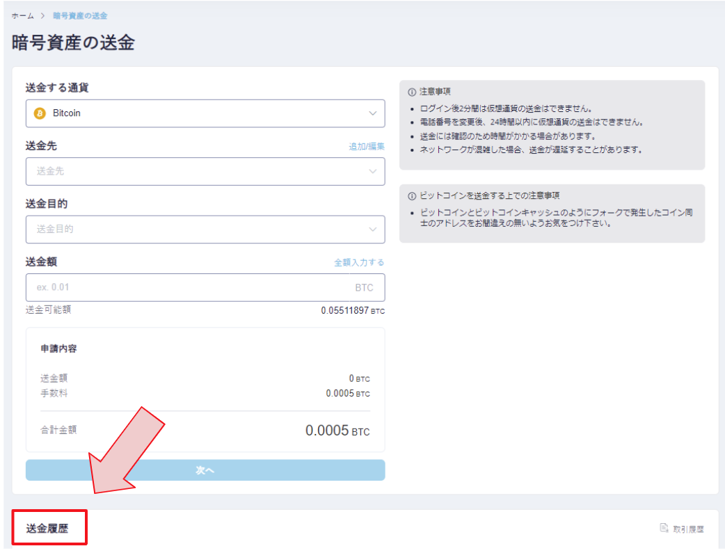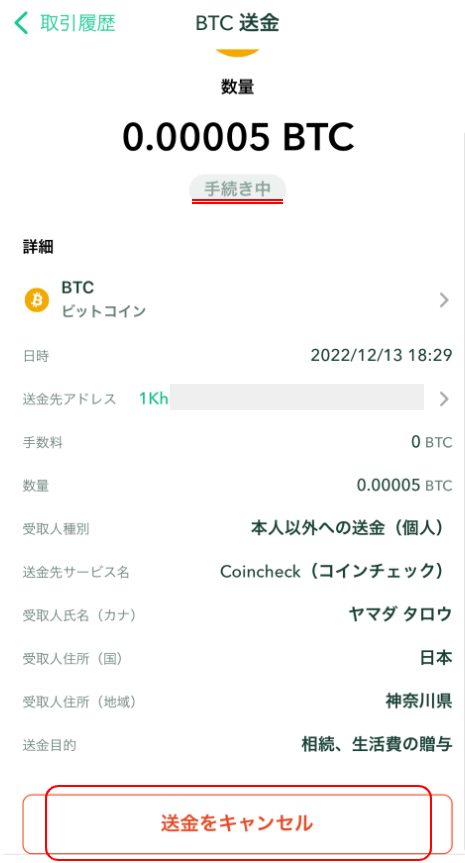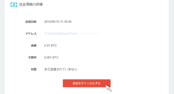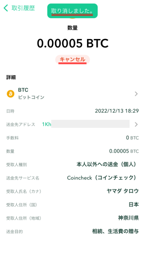 暗号資産の送金の操作後でも、コインの送金履歴上で送金処理が完了していなければ、キャンセル処理が可能です。