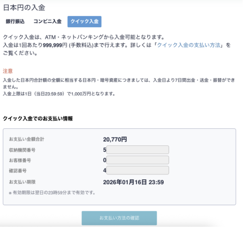 - 「クイック入金でのお支払い情報」が表示されるのでメモなどにお控えください(※3)