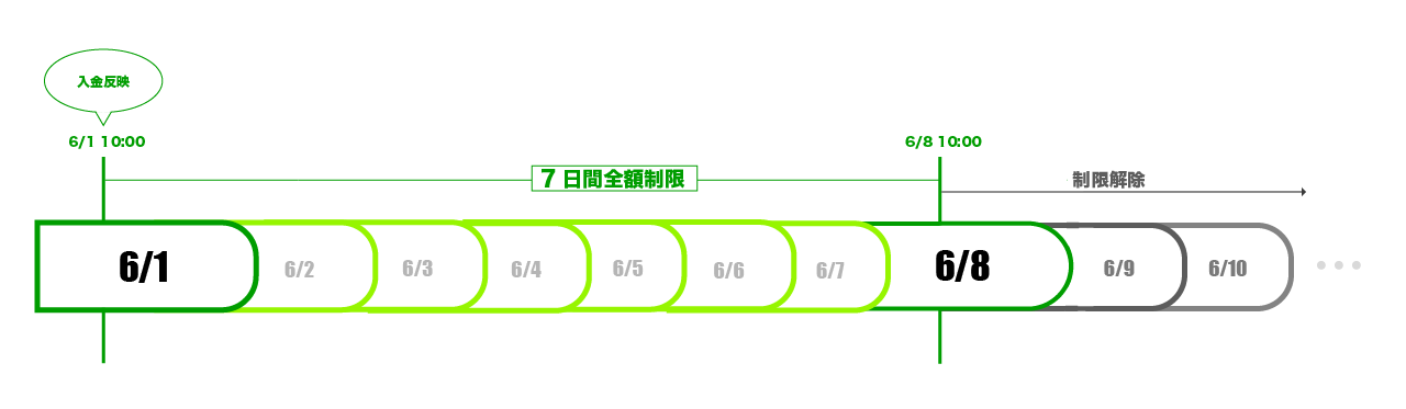 - 入金・決済を行った直後の7日間、相当額の資産をユーザーは口座から出金・送金などができない