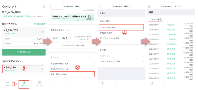 Coincheckつみたての履歴をアプリから確認する場合、つみたての画面からポートフォリオや次回のスケジュールを確認できます。