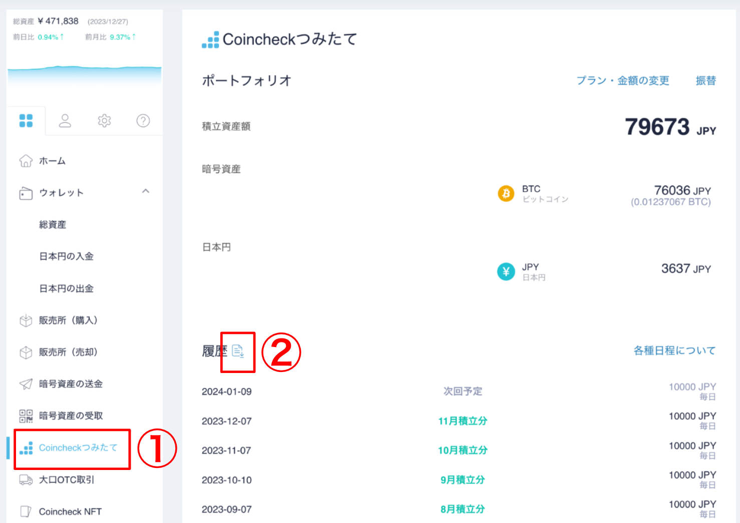 Coincheckつみたての履歴をブラウザから確認する場合、Coincheckつみたての画面で、ポートフォリオと毎月の履歴(買付日)が確認できます。
