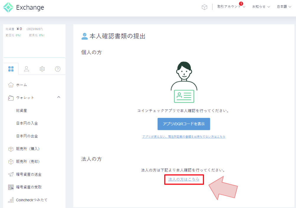 登録完了後、Webブラウザを利用して本人確認申請を行うときに、「個人の方」「法人の方」で分けられております(以下参考画像)ので、「法人の方はこちら」のリンクから申請をお進めください。