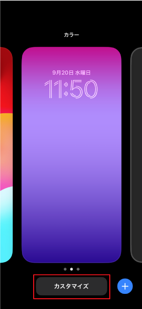 1.ロック画面上を長押しすると編集画面が表示されるので、「カスタマイズ」をタップする。