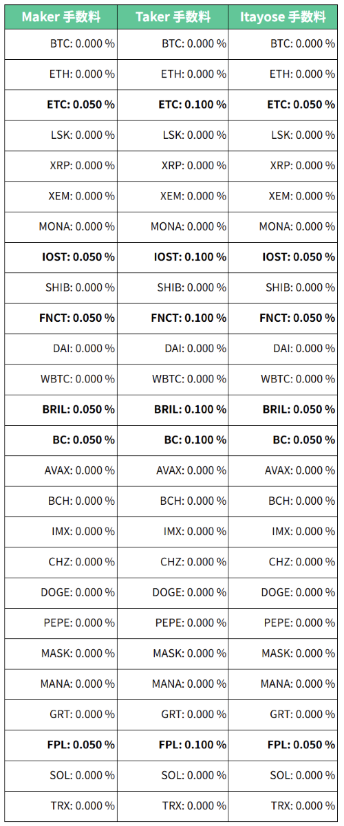 - 板寄せ(Itayose)の手数料は、取引所が停止し再開する際に実施される板寄せで約定した際に一律で適用されます。