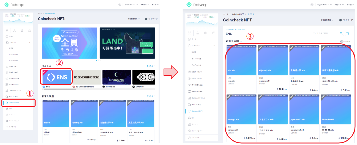 NFTアイテムのENSは、Coincheckで口座開設が完了しているアカウントにて、Coincheck NFTページより購入が可能です。
