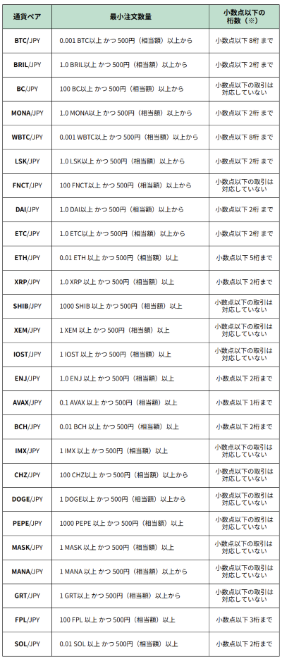 各取扱通貨ペアでの最小注文数量と小数点以下の桁数は、以下のとおりです。