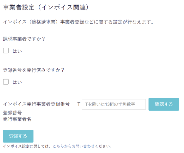 インボイス発行をご希望の場合は、こちら のリンク先にある「事業者設定(インボイス関連)」から、「登録番号を発行済みですか?」の下にある「はい」のチェックボックスを選択してください。