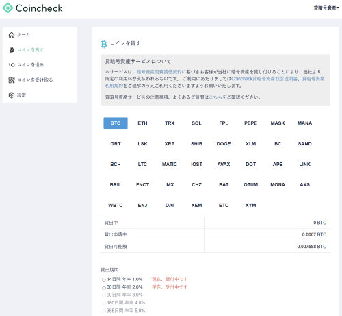 ※貸暗号資産ページ の「コインを貸す」でもご確認いただけます。