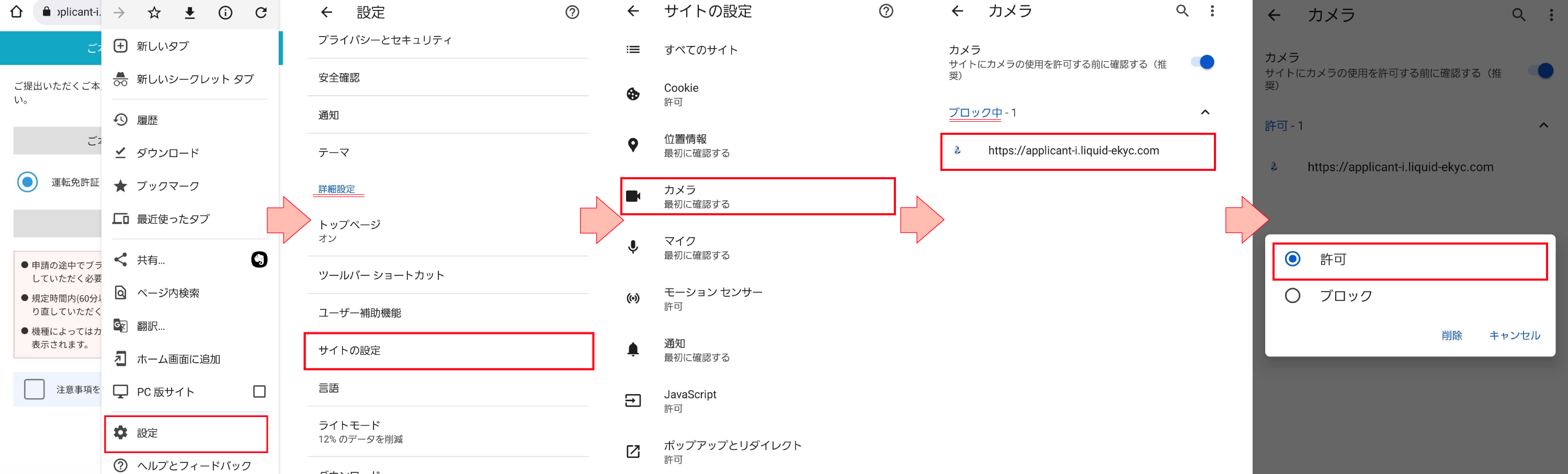 ⑤「ブロック中」のアドレス一覧に「.../applicant-i.liquid-ekyc...」がある場合、これをタップし、「許可」に変更する。