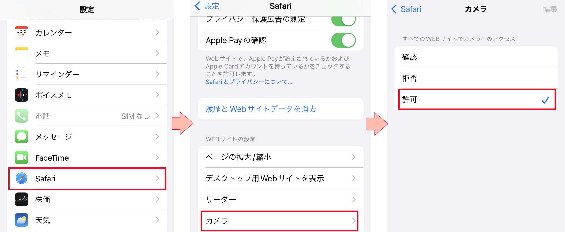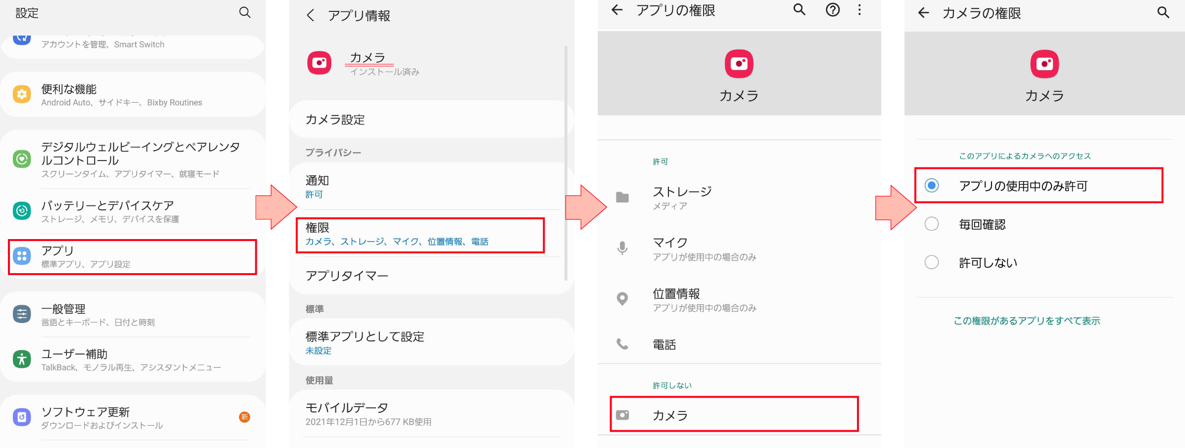 ③「カメラ」のアプリ情報内より「権限」>「カメラ」をタップする