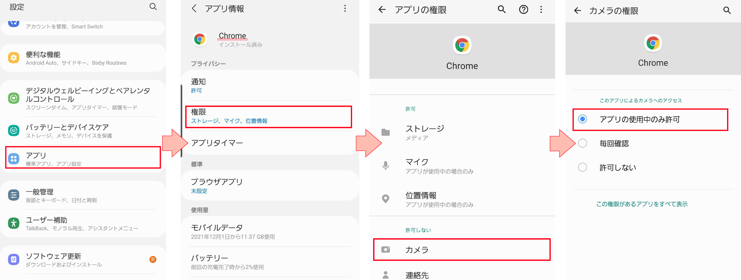 ③「Chrome」のアプリ情報内より「権限」>「カメラ」をタップする