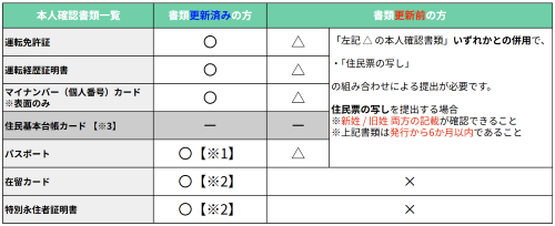 - 書類未更新の場合、以下○印の5種類の本人確認書類と住民票の写しの組み合わせでの提出が必要です。