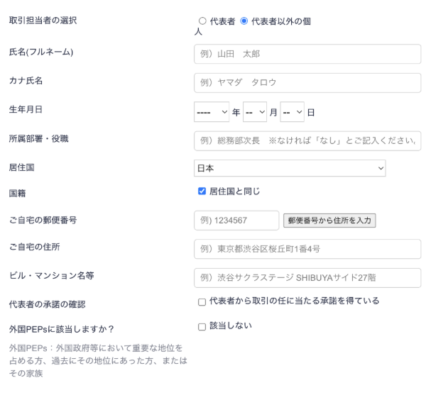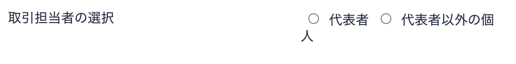 - 「代表者 ≠ 取引担当者」の場合、代表者と取引担当者の情報を入力し、所定のチェックボックスにチェックを入れてください。