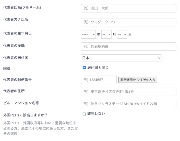 法人ご登録時につきまして、「犯罪による収益の移転防止に関する法律」にもとづき、実質的支配者に関する本人特定事項として、その個人の方のお名前・ご住所・生年月日などを確認する必要があります。