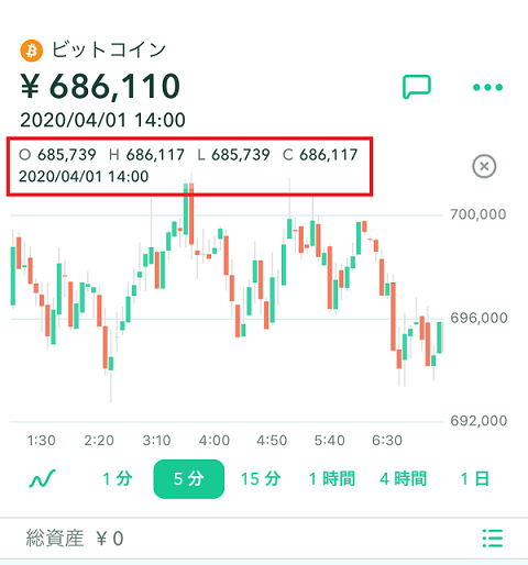 iOSアプリのロウソク足画面の「O,H,L,C」はどういう意味ですか?