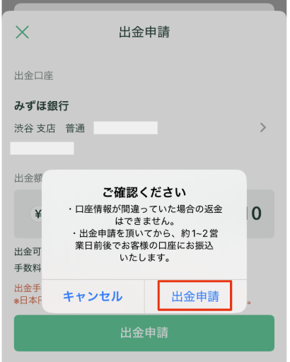 5. 「ご確認ください」の画面が表示されます。内容をご確認の上問題がない場合は、「出金申請」をタップしてください。